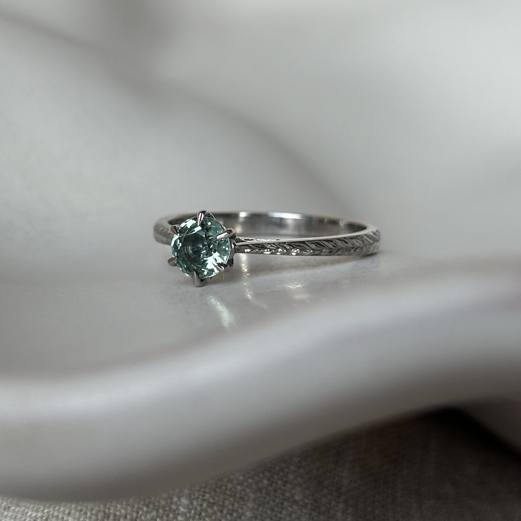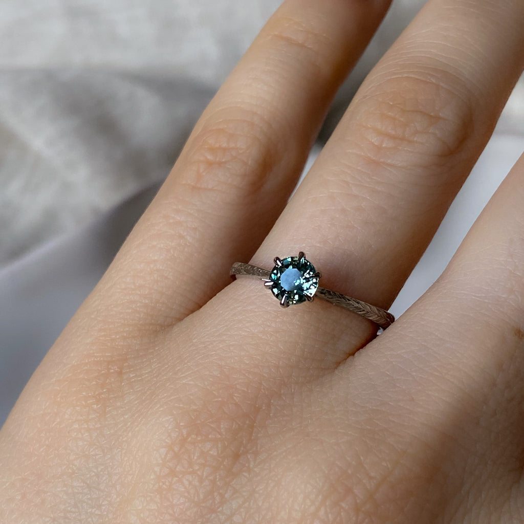 Due to the unique nature of teal - green sapphires, no two stones are alike. Once you have placed your order, you may choose from our collection of available gemstones or we will select one. The ring pictured above holds a 1ct centre stone, stone colour may vary from mid green to deep teal.
